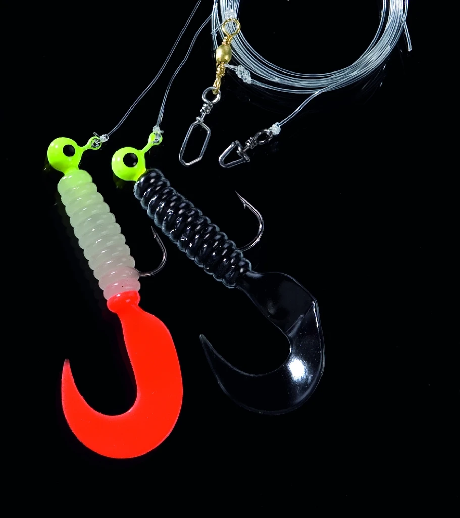 Voorzien van een zwarte en een luminous/japans rode twister en gele jigkoppen..