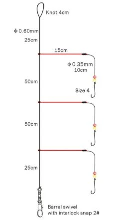 Deze onderlijn is ontworpen voor het vangen van grote kabeljauw. Zij wachten onder een school prooivis, jagen ze van onderaf op en vallen aan. Laat de onderlijn daarom door een school kleine prooivis zakken en wacht met aanslaan totdat je de druk op de lijn voelt toenemen.