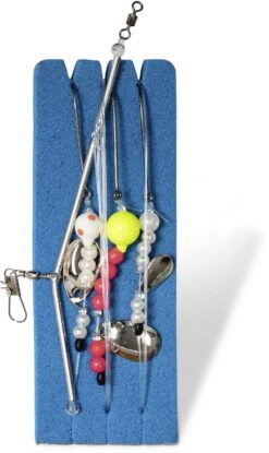 Montage voor het vissen met natuurlijk aas vanuit de boot op platvis. Met drie haken, spinnerbladen en lokkraaltjes en een afhouder. Wordt geleverd met een extra onderlijn zodat u via een speciale kraal snel kunt omwisselen als dat nodig is.
