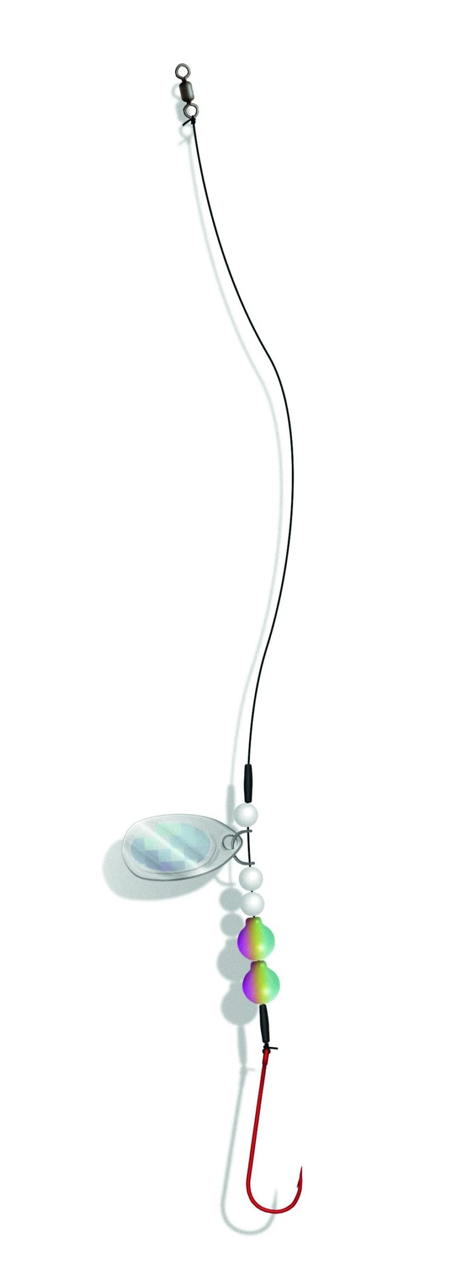 Verfijnde platvisonderlijn met een combinatie van een klein spinnerblad en twee lokkralen.