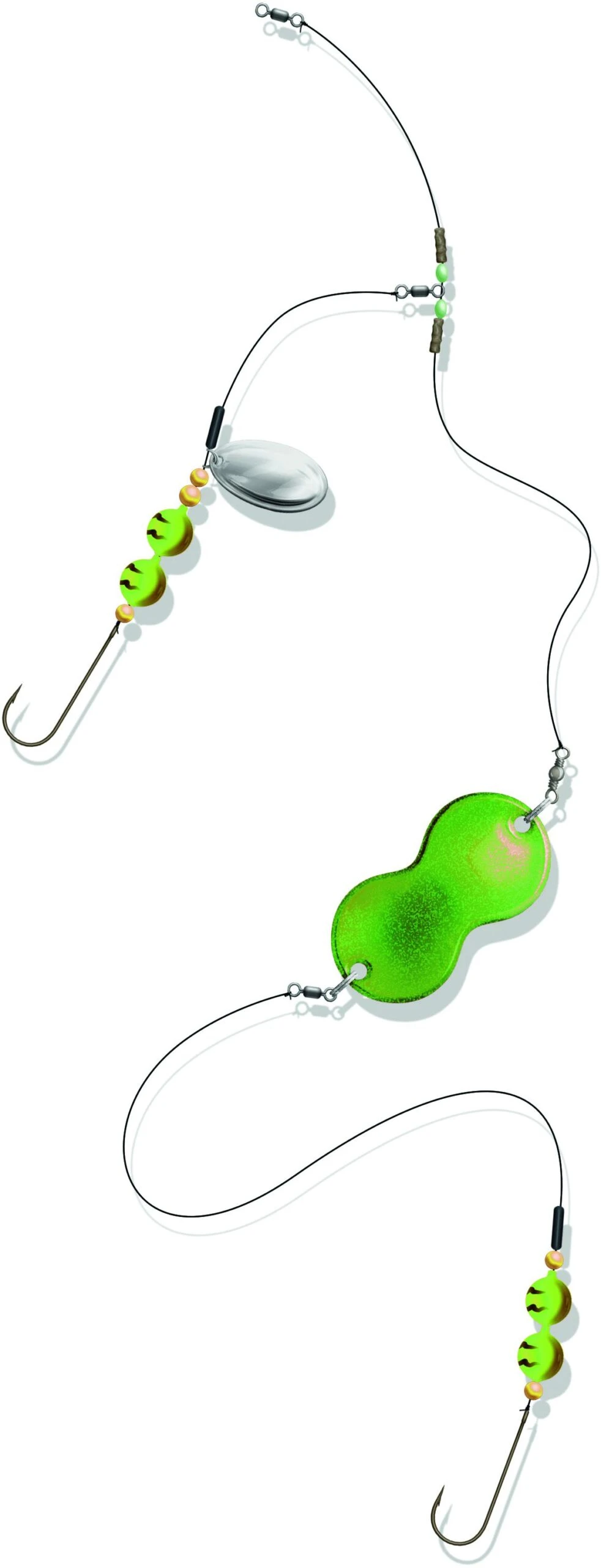 Platvismontage met een loodvrije teaser en twee onderlijnen – één zijlijn en één dwarrellijn – voorzien van spinnerbladen en lokkralen.