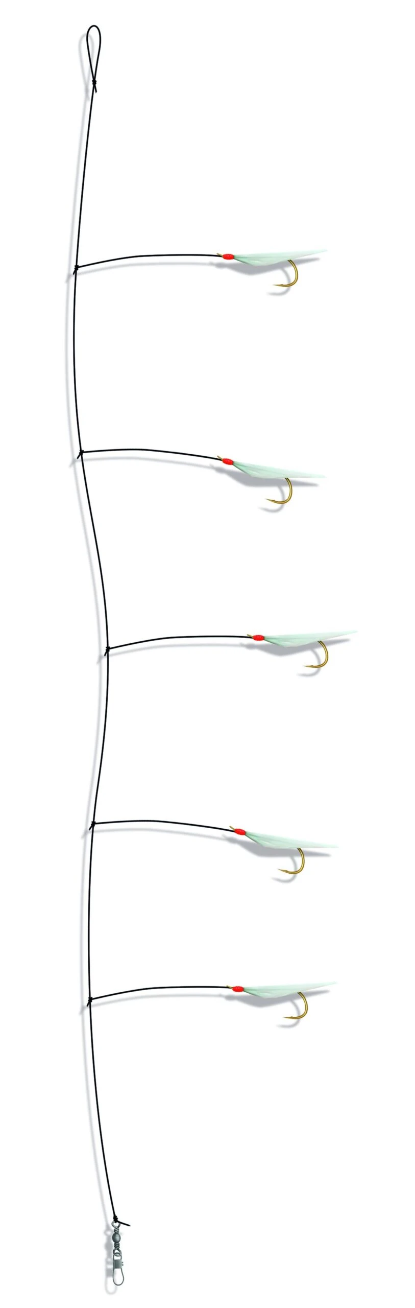 Deze haringmontage bleek de voorbije jaren bijzonder efficiënt voor het vangen van haring en wijting. 5 vliegen van echte vissenhuid, gebonden op een goudkleurige haak.
