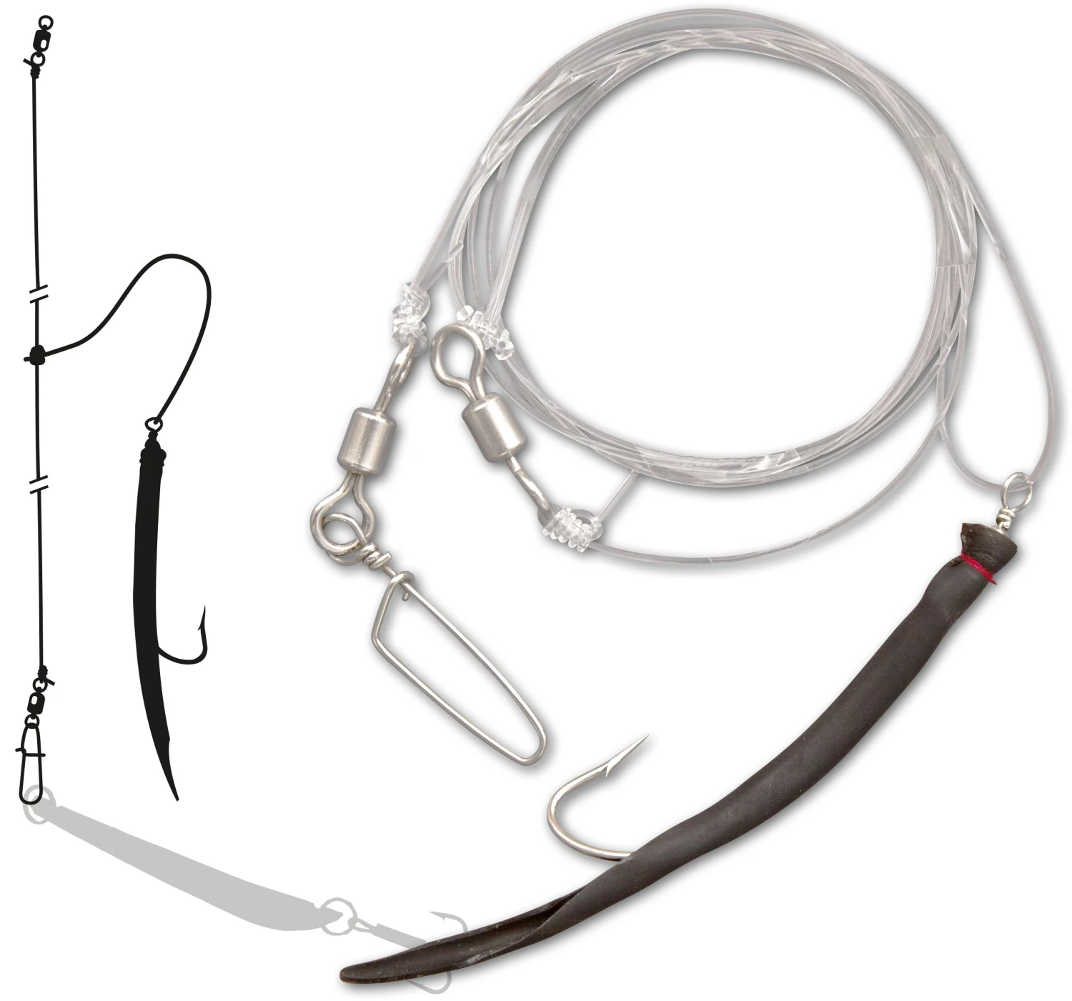 1 Makk, hoofdlijn 0,80 mm, onderlijn 0,80 mm, trekkracht 40 kg. Voor de bootvisserij op kabeljauw, koolvis of pollak, om boven pilkers of shads te monteren. Wordt op een ronde spoel geleverd.